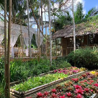 Her bor vi midt i naturen i små træhuse omgivet af rismarker og frugttræer. Her er fred, frisk luft og en varm lokal atmosfære.